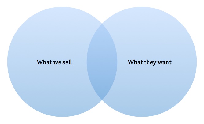 In this diagram, the first circle includes all the ways our products satisfy, and the second circle includes all the things that new audiences say they desire. The place where these two circles overlap contains all the information we need to motivate new audiences to participate by convincing them that our products will satisfy their yearnings. But if we never learn what’s in that second circle, we’ll never discover the place where what we sell and what they want come together. And if we insist on filling the second circle with what we wish were there, or what we believe will appear there if they decide to participate, the information in the overlap will be meaningless and motivationally impotent.