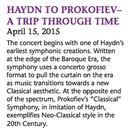 Imagine yourself sitting in a busy Starbucks where the gal sitting next to you is a smart, 28-year-old tech executive who, as it turns out, played clarinet in her high school orchestra. You get to chatting and you decide to persuade her to come to your upcoming concert, so you lean in and say, “Written at the edge of the Baroque Era, the symphony uses a concerto grosso format to pull the curtain on the era as music transitions towards a new Classical aesthetic. At the opposite end of the spectrum, Prokofiev’s “Classical” Symphony, in imitation of Haydn, exemplifies Neo-Classical style in the 20th Century.”